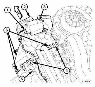 4. Install the three metal retaining clips (6) that secure the rear distribution housing to the rear heater-A/C housing.
